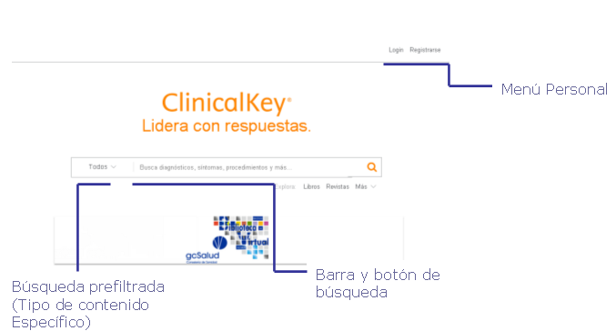 En la página principal de ClinicalKey encontrará un cajetín de búsqueda en el que deberá introducir la palabra/palabras de búsqueda. Gracias a la búsqueda predictiva mientras introduce los términos de búsqueda automáticamente mediante un menú de autosugerencias, ClinicalKey muestra términos, sugerencias, libros, revistas y autores relevantes que contengan esos caracteres.