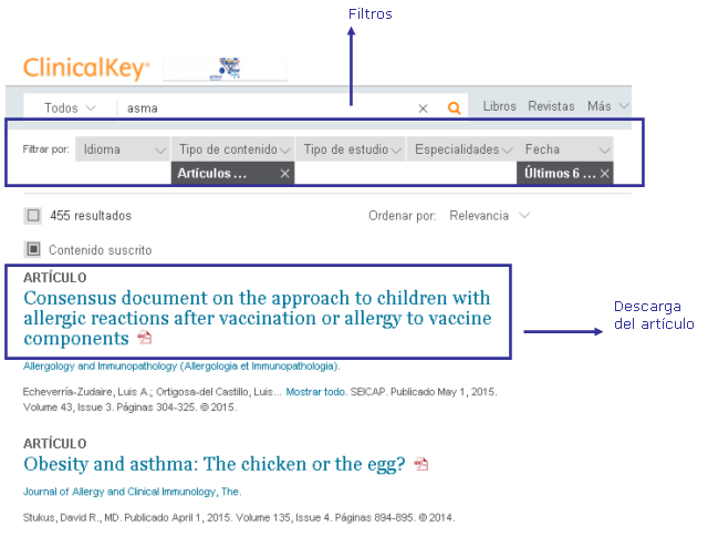 Clinicalkey ofrece a todos sus usuarios registrados una serie de funcionalidades para trabajar con los resultados de las búsquedas: