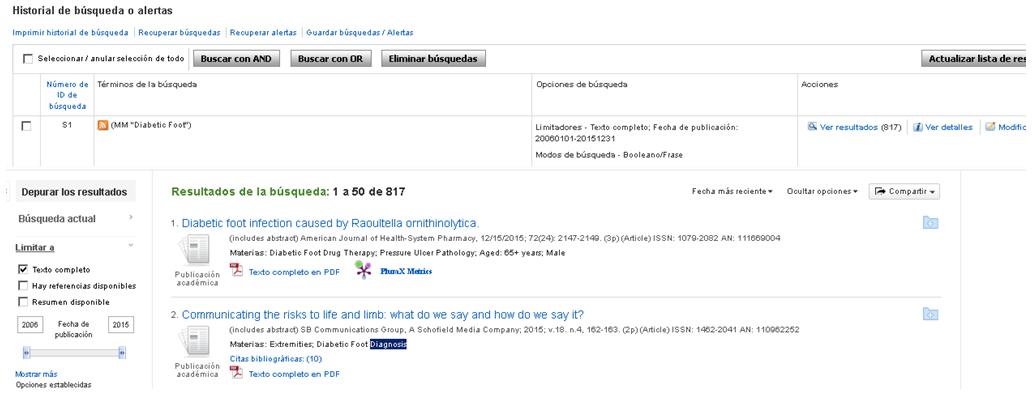 Si buscamos documentos con texto completo sobre tratamiento de úlceras de pie diabético "diabetic foot ulcer" publicados entre 2006 y 2016 y que sea una búsqueda equilibrada entre específica y sensible.