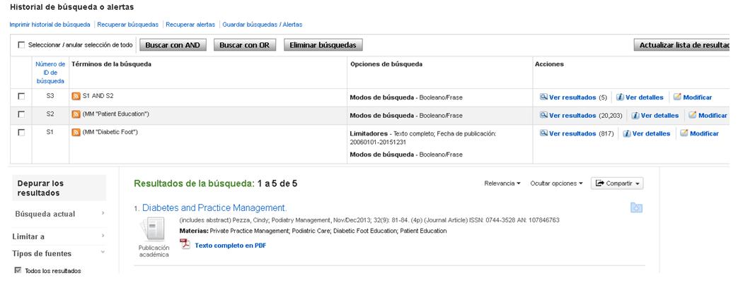 . Con la opción "Guardar búsquedas/alertas", podemos guardar el Historial en la plataforma de EBSCO, si estamos registrados, para volver a ejecutarlo en otra sesión, o crearnos una Alerta que nos avise cuando entre en la base de datos un artículo nuevo relacionado con el tema de nuestro interés.