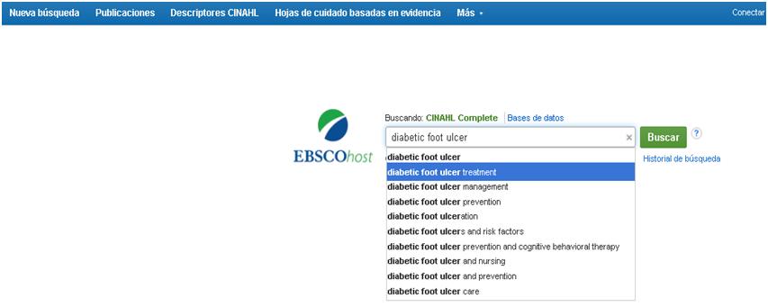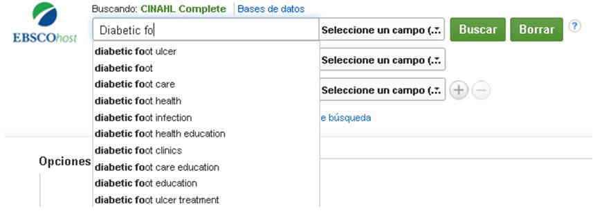 Introducimos en la primera casilla "diabetic fo..." y se nos despliega un índice de ayuda dónde encontramos el término que buscamos, lo seleccionamos