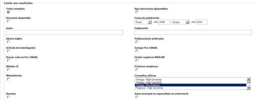 Luego, desde "Límite sus resultados", marcamos, texto completo, las fechas de nuestro interés, en "Consultas clínicas" marcamos la opción "Therapy-Best Balace" y buscamos: