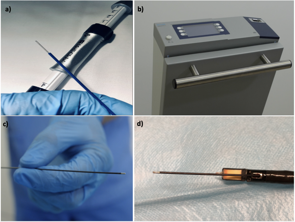 Figura 1. (a) Aguja de 22G (SonoTip® TopGain, Medi-Globe), con diseño de punta de triple bisel en corona. (b) Sistema de crioterapia ERBECRYO® 2. (c) Criosonda de 1,1 mm (Erbecryo 20402-401, Tübingen, Alemania). (d) Criosonda de 1,1 mm introducida a través del canal de trabajo del ecobroncoscopio EBUS (Pentax Medical EB19-J10U).