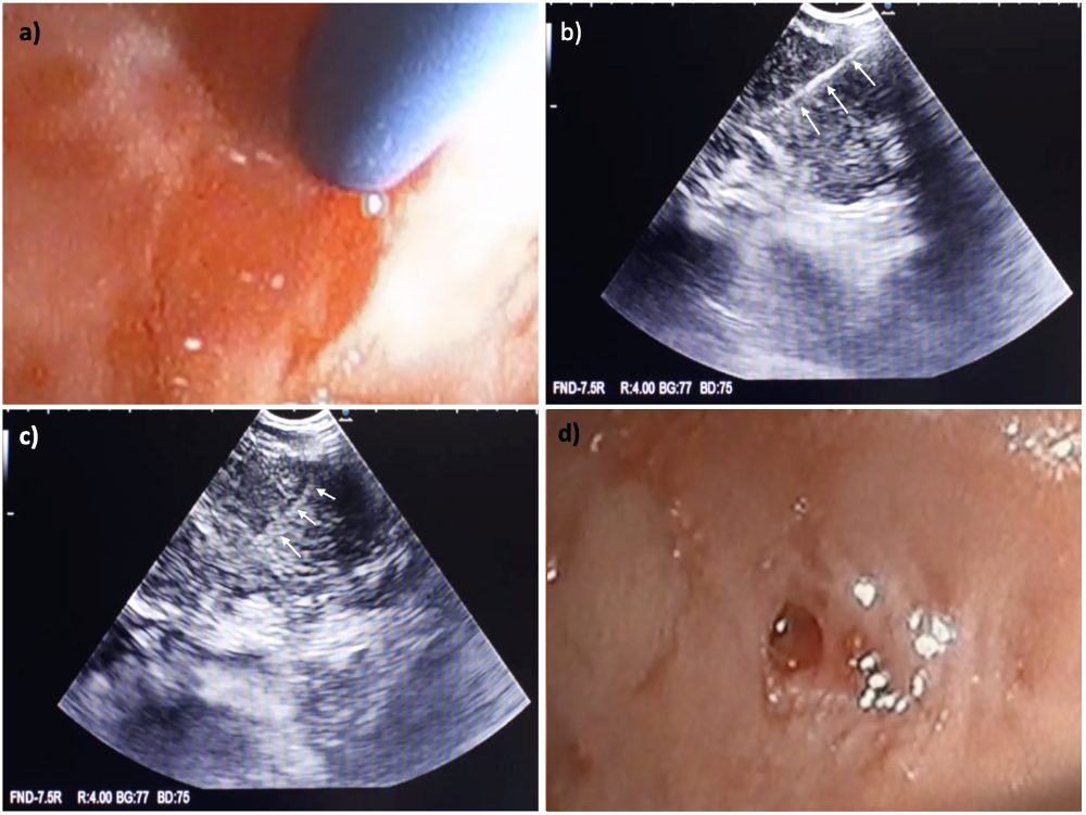Figura 2. (a) Realización de EBUS-TBNA en estación ganglionar 7; se observa la vaina de la aguja TBNA. (b) Imagen ecográfica del ganglio linfático con la aguja de 22G en su interior (flechas blancas). (c) Trazado ecográfico del trayecto dejado por la aguja tras tres punciones (flechas blancas). (d) Sitio de punción observado por EBUS tras retirada de la aguja (flechas blancas).