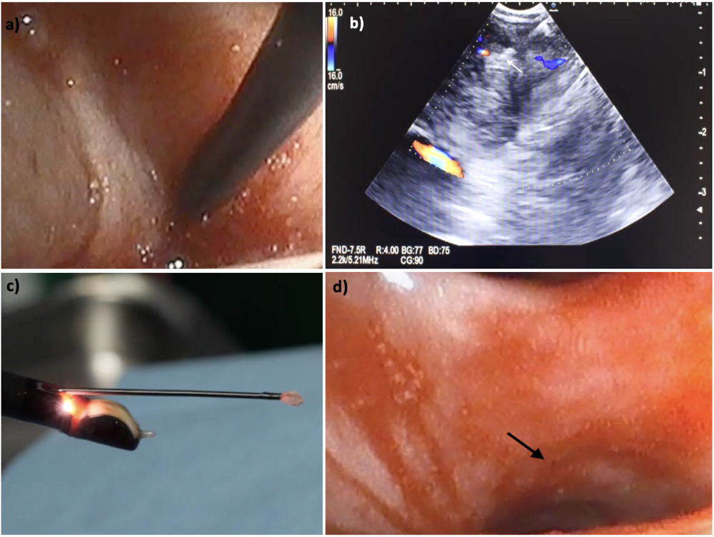 Figura 3. (a) Punta de la criosonda aproximándose al trayecto de punción. (b) Imagen EBUSDoppler mostrando la punta de la criosonda de 1,1 mm dentro del ganglio (flecha blanca). (c) Muestra de criobiopsia adherida a la punta de la criosonda. (d) Ausencia de sangrado posterior a la criobiopsia.