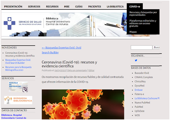 La Biblioteca del HUCA, ante esta nueva situación, recopila diariamente recursos de calidad que pone a disposición de los usuarios a través de su web. Editoriales, editores y plataformas de información han dejado libres sus recursos relacionados con COVID-19 porque es importante tenerlos recogidos en un lugar accesible. Para este fin ha habilitado una nueva pestaña en su portal, COVID-19