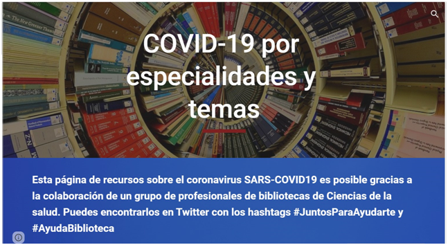 A través de esa pestaña se accede a un proyecto de recopilación de información fiable y contrastada sobre COVID-19, a nivel nacional. Esta iniciativa parte de una reunión virtual (16/03/2020) convocada por María García Puente (Fundación Jiménez Díaz), para compartir experiencias de teletrabajo durante la pandemia por parte de los y las profesionales que están a cargo de las Bibliotecas de Ciencias de la Salud en España.