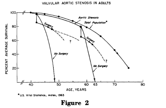 La introducción de esta tecnología, lo mismo que muchas otras entonces y todavía hoy, no se sometió a un ensayo clínico que pudiera evaluar su utilidad a la vez que sus riesgos. Los diferentes cirujanos fueron introduciendo sus modelos de prótesis y su abordaje quirúrgico sin un plan preestablecido y en 1968 era ya una práctica habitual. En el Hospital General de Asturias la había introducido el doctor Alonso Leg a comienzos de la década de 1960, siendo el primer hospital de España en realizar una sustitución valvular, en ese caso de la válvula la mitral. Los autores de la revisión, y de la recomendación, pertenecían al National Institute of Health y su toma de postura sobre un asunto tan complicado y candente tiene mucha importancia. Ellos en ningún momento se lamentan de la ausencia de estudios controlados, parece que se hubieran conformado con tener información fehaciente sobre la historia natural de la estenosis aórtica documentada con estudios hemodinámicos. Con ello, y con el conocimiento disponible del pronóstico en pacientes intervenidos, podrían comparar supervivencia y morbilidad ajustada por el gradiente presión de ventrículo izquierdo a la aorta. Sería un estudio observacional. Estamos en la década de 1960 cuando la epidemiología aplicada a la investigación estaba daba sus primeros pasos, ni si quiera entonces se conocían medidas de impacto como el odds ratio y lo más frecuente es que se hicieran comparacionnes buscando únicamente diferencias significativas. Hoy sabemos que los estudios observacionales tienen muchos problemas de validez debido a los sesgos y los confusores. Por ejemplo que se operen los de mejor pronóstico porque tienen menos comorbilidad o menos factores de riesgo o aquellos que en el cateterismo se vea que son operables. Precisamente por eso en los ensayos clínicos solo se admite a los que pueden recibir la intervención, independientemente de que después caigan en un grupo u otro. Los autores no realizan una comparación formal entre los datos recogidos de estudios retrospectivos de tratamiento conservador y los que tienen de los prospectivos de la intervención. Hacerlo sería difícil por varias razones además de las ya comentadas. La primera un problema de mala clasificación: los datos recogidos para un objetivo diferente del propuesto pueden ser poco fiables y probablemente fueran más precisos en los intervenidos porque ya se recogían con ese objetivo. Se produce mala clasificación diferencial, un sesgo. Otro problema es la evolución posible de las definiciones y de los tratamientos, por eso los controles históricos son poco fiables. Todo ello se resuelve con estudios prospectivos. Y aunque los ensayos clínicos son la regla, un buen estudio prospectivo que evite las malas clasificaciones diferenciales, aquellas en las que la información o resultado se obtiene de manera diferente según sea de un grupo u otro y controle los confusores, debe constituirse en el futuro como un medio alternativo para obtener conocimiento.