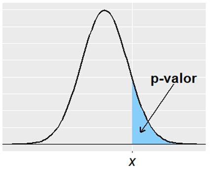 Llamaremos p-valor a la probabilidad de obtener un valor tan extremo o más que el x obtenido con la muestra, suponiendo que la hipótesis nula H0 es cierta. Por ejemplo, para el caso de un contraste de una cola a la derecha sería: p-valor = P(X ≥ x / H0 cierta).