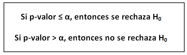 Dado que lo más usual es tomar α = 0.05, tendríamos entonces que si el p-valor es menor o igual que 0.05, rechazaríamos H0, mientras que si el p-valor es mayor que 0.05, no rechazaríamos H0.