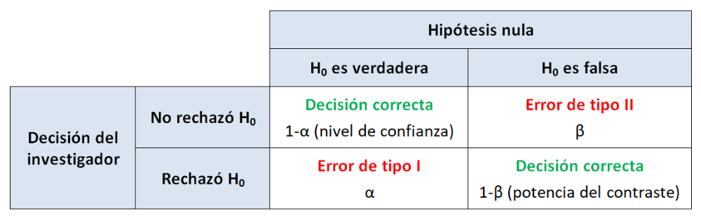 Una vez realizado el contraste de hipótesis, la decisión será rechazar o no rechazar H0 y, teniendo en cuenta que H0 puede ser verdadera o falsa, se pueden dar las cuatro situaciones que se exponen en la siguiente tabla.