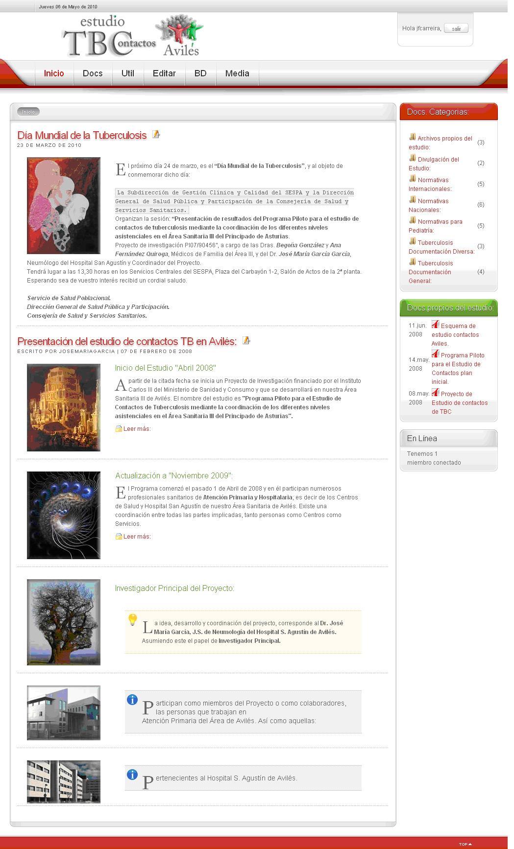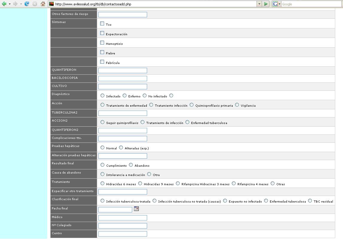 Se creó un Grupo de Trabajo en el que están coordinados Salud Pública, Atención Primaria y Especializada (Neumología, Medicina Interna, Pediatría., Microbiología, Radiología), y en el que se han consensuado pautas comunes y se comparten las decisiones del estudio de contactos. Para ello se realizaron visitas de formación y consenso a los Centros de Salud. Se realizó una jornada de formación para todos los profesionales del Área. Se creó una web http://www.avilessalud.org/tb/ para divulgación del estudio entre los profesionales del área, resto del personal sanitario y población general. En la web existe una base de datos (antecedentes de vacunación con BCG, tuberculosis y tratamiento, tuberculina y profilaxis previas, tipo de contacto relación y duración, síntomas, radiografía de tórax, diagnóstico de infección con tuberculina y Quantiferon) que se utiliza para la toma de decisiones terapéuticas, y para conocer el cumplimiento del tratamiento instaurado. A la base de datos se accedía mediante clave de usuario y contraseña administrada a los miembros del Grupo y en la que se introducían los datos ya reseñados tras el diagnóstico de un caso de tuberculosis e identificación y estudio de los contactos. Todo ello de acuerdo con la legislación vigente en materia de seguridad y confidencialidad en el tratamiento de datos.