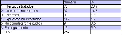 Desde Abril de 2008, hemos diagnosticado a 50 pacientes de tuberculosis y hemos estudiado 254 contactos. En dos pacientes no se han estudiado contactos porque no se han identificado. Se han evaluado todos los contactos identificados, solamente una persona abandonó la evaluación ya iniciada. La clasificación final de los contactos es la siguiente (Tabla 1):