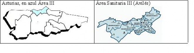Figura1. Área Sanitaria de AvilésEl Área Sanitaria III de Asturias cuenta con una población de 155621 habitantes (Censo 2005) con 6 zonas básicas de Salud con 10 Centros de Salud y 13 consultorios periféricos así como un Hospital de referencia (Hospital San Agustín de Avilés, HSA).