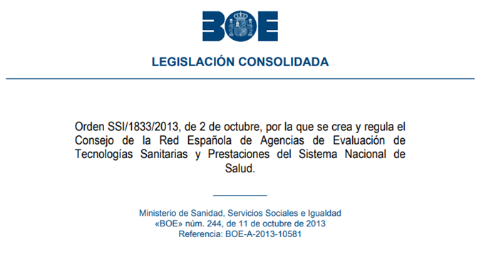 - Orden SSI/1833/2013, de 2 de octubre, por la que se crea y regula el Consejo de la Red Española de Agencias de Evaluación de Tecnologías Sanitarias y Prestaciones del Sistema Nacional de Salud Núm. 244 Viernes 11 de octubre de 2013