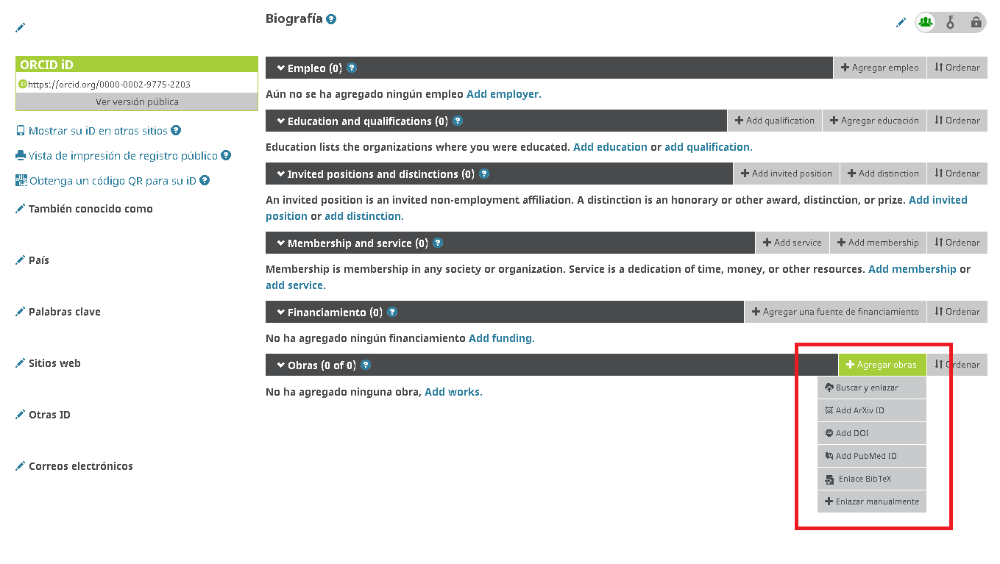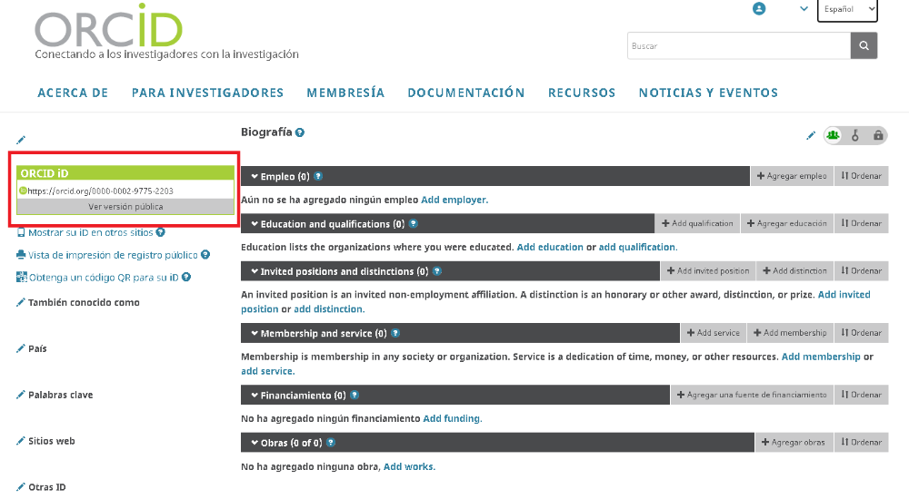 A continuación, entraremos en nuestro registro ORCID a través de nuestro correo electrónico y contraseña, donde visualizaremos nuestro ORCID iD ya generado y podremos añadir más información y vincular nuestro ORCID con otros identificadores como por ejemplo Scopus o Publons.