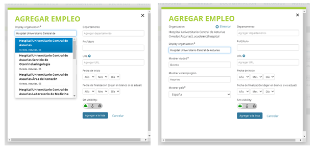 En caso de doble dependencia institucional, por ejemplo, el Hospital Universitario Central de Asturias y la Universidad de Oviedo, también se consignará en este apartado haciendo clic en Agregar empleo y completar otro registro, y así por cada institución con la que se esté o se haya estado vinculado.