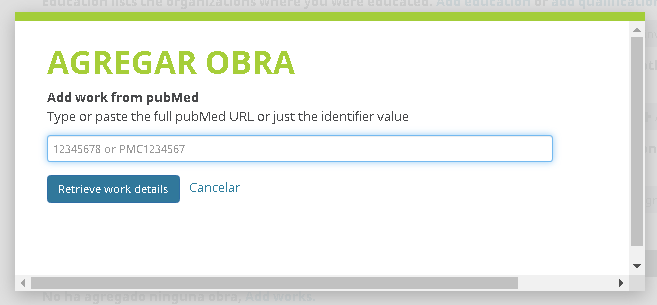 Seleccionando la opción ArXiv ID, DOI, PubMed ID se pueden agregar artículos seleccionando cualquiera de estas tres opciones y escribiendo el identificador en el cajetín. Por ejemplo el PubMed ID: